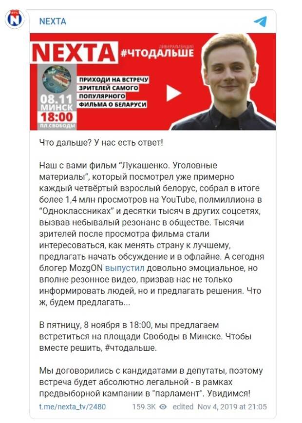 8 ноября на площади Свободы встретились все блогеры сетки, которая раскачала эту революцию. Помимо картонного Нехты, был живой Сергей Тихановский, который провёл первый стрим с массовой акции. Были также известные авторы «Беларусь головного мозга», Пальчис и другие менее популярные. Но они все там были. Смотрели, как сработала схема «акция на удалёнке» через Telegram, потому что главного героя и автора скандального фильма не было. Как нет всех этих блогеров в стране сейчас.