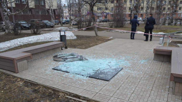 Арт-объект, выполненный из стекла и металла, был разбит, а на пьедестале образовалась трещина.