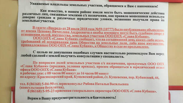 С самой Натальей Стришней RT поговорить не удалось. На двери административного здания ОПХ «Слава Кубани» висит предупреждение о попытках мошенников завладеть землями сельхозназначения.