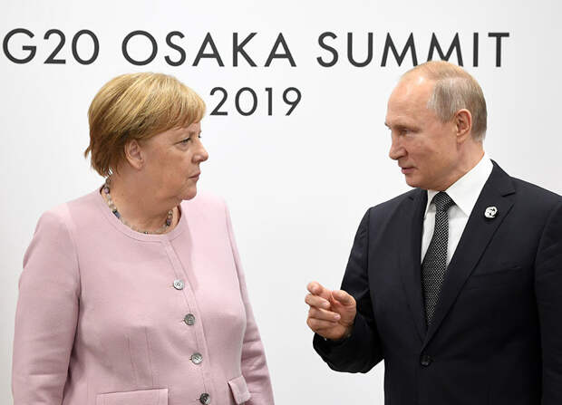 Президент РФ Владимир Путин и федеральный канцлер Германии Ангела Меркель на саммите G20 в Осаке Илья Питалев