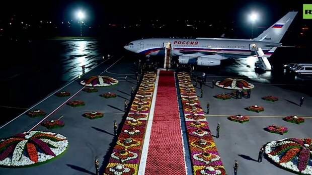 В международном аэропорту Душанбе перед самолётом, на котором прилетел в столицу Таджикистана президент России Владимир Путин, расстелили ковровую дорожку с цветами.