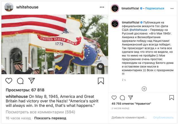 Белый дом в своём официальном аккаунте в Instagram заявил, что победу над нацизмом одержали США и Великобритания, но не упомянул о вкладе Советского Союза в победу.