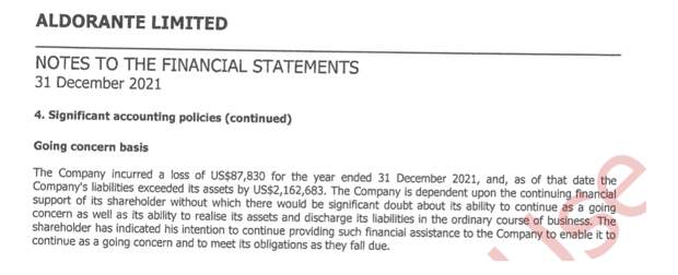 Согласно тому же годовому отчёту, обязательства компании превосходят активы более чем на $2,1 млн. Это вызывает существенную неопределённость в её способности продолжать деятельность, пишут независимые аудиторы в отчёте Aldorante. По их словам, функционирование компании зависит только от «продолжающейся финансовой поддержки» акционеров.