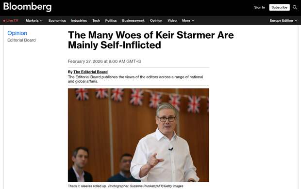 Тем временем Bloomberg подчёркивает, что неприятности британского премьера — следствие его собственной политики. «Во множестве бед Кира Стармера виноват, главным образом, он сам», — гласит заголовок.
