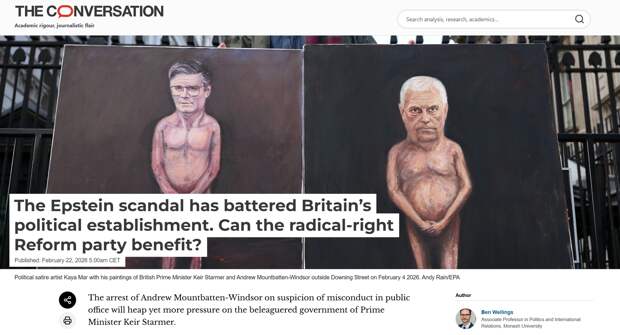Со своей стороны, The Conversation констатирует, что скандал вокруг дела Эпштейна превратился в «избиение» британского истеблишмента: авторитет потеряло не только правительство Стармера, но и один из самых древних институтов Великобритании — королевская семья.