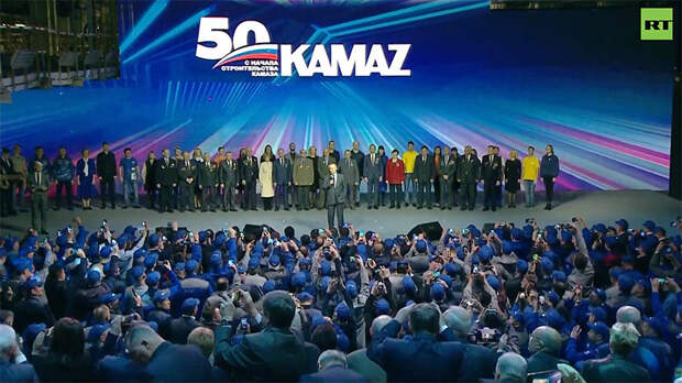 Президент России Владимир Путин совершает рабочий визит в Набережные Челны. Глава государства принял участие в торжественном митинге, посвящённом 50-летию образования КамАЗа. RT вёл прямую трансляцию.