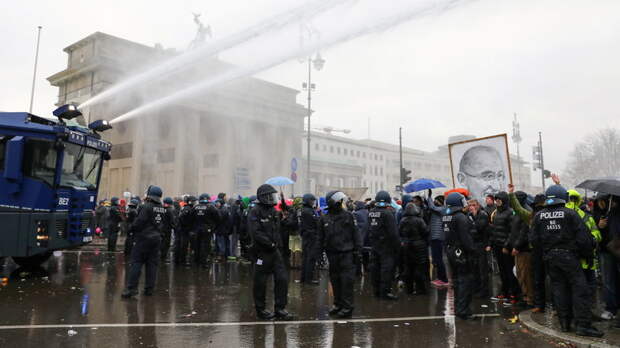Полицейские применили водомёты для разгона демонстрации у Бранденбургских ворот в центре Берлина, где проходит акция протеста в связи с введёнными в ФРГ мерами по борьбе с коронавирусом.