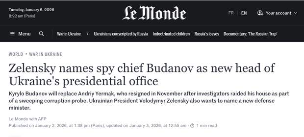 Le Monde отмечает, что назначение бывшего главы ГУР Буданова новым руководителем офиса Зеленского «произошло в ключевой момент» украинского конфликта, когда глава киевского режима объявил, что соглашение о прекращении конфликта, достигнутое при посредничестве США, готово «на 90%».