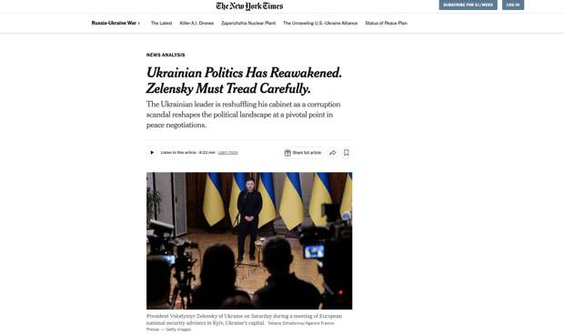 «Господин Зеленский, как считают аналитики, не торопился с этим от части потому, что коррупционный скандал, который затронул его внутренний круг и ослабил его собственные позиции, вынудил его действовать более осторожно», — пишет The New York Times.