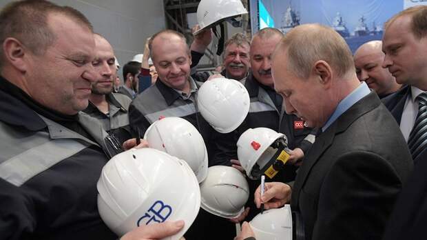 Российский лидер Владимир Путин расписался на касках рабочих судостроительного завода «Северная верфь».