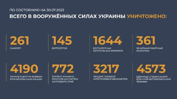 30 июля в Минобороны уточнили данные по погибшим и пострадавшим в результате ракетного удара ВСУ по следственному изолятору в Еленовке, где содержались украинские военнопленные, в том числе бойцы нацбатальона «Азов». Число жертв составляет 50 человек, ещё 73 украинца доставлены в медучреждения с тяжёлыми ранениями.