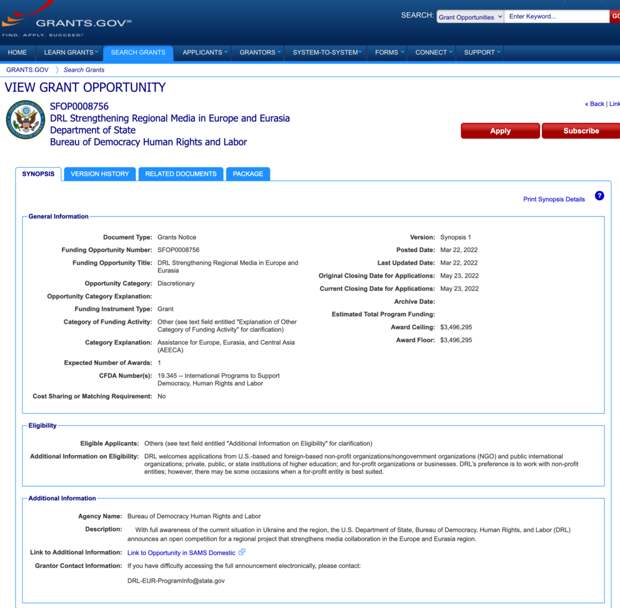 Грант учреждён с целью борьбы с дезинформацией и «внешними источниками влияния», которые хотят «манипулировать» независимыми СМИ. Ещё один грант стоимостью $740 тыс. выделен на обучение молодых журналистов в Венгрии. В нынешних условиях, говорят эксперты, Вашингтону важно изменить общественное мнение жителей стран постсоветского пространства о Москве, и гранты независимым медиа — один из наиболее эффективных способов достичь этой цели.Бюро по вопросам демократии, прав человека и труда (DRL) Госдепа США объявило тендер на получение грантов для журналистов общей стоимостью $ 3,5 млн 22 марта 2022 года. Целью гранта заявлено противостояние силам, стремящимся манипулировать независимой прессой, контролировать её или изолировать.