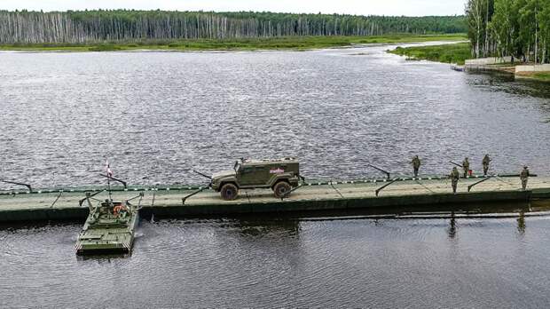 В сообщении указано, что во время наведения моста произошло самопроизвольное складывание одной из опор. Двое военных получили травмы.