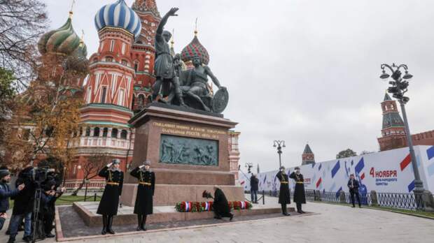 Президент России Владимир Путин в День народного единства возложил цветы к памятнику Кузьме Минину и Дмитрию Пожарскому на Красной площади в Москве.