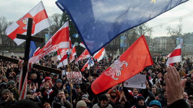 К её началу на площади собрались несколько сотен человек, некоторые из которых развернули традиционные для оппозиции бело-красно-белые флаги, а также флаги Евросоюза, выступая тем самым за развитие контактов с ЕС.