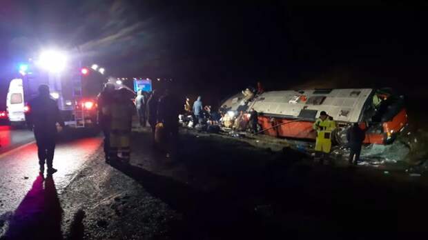 Сообщалось, что в результате опрокидывания автобуса погибли два человека, восемь пострадали.