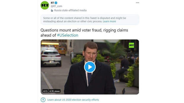 Социальная сеть Twitter отметила репортаж телеканала RT о выборах президента в США как вводящий в заблуждение.
