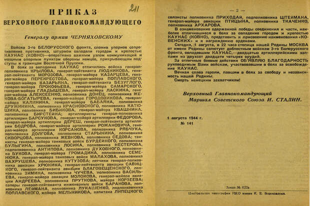 «... в 22 часа столица нашей Родины Москва от имени Родины салютует доблестным войскам 3-го Белорусского фронта, овладевшим Каунасом, двадцатью артиллерийскими залпами из двухсот двадцати четырёх орудий», — говорится в приказе.