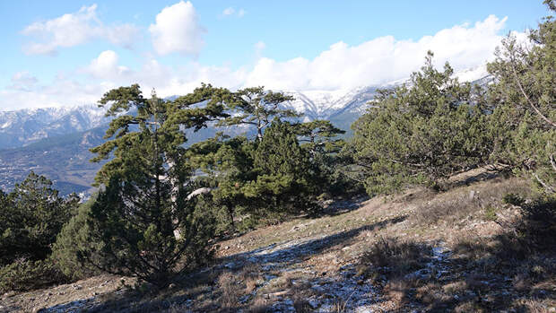 Это можжевеловая роща (она расположена после населённого пункта Советское, не доезжая до заповедника). И дорога туда потрясающе красива, и сама роща восхитительна. Она идеально подойдёт любителям пеших прогулок: тропинки там проложены и протоптаны, воздух кристально свеж, а из самой рощи открываются впечатляющие виды на Ялту и горы.Кстати, весенняя (с точки зрения москвича) погода в Ялте очень располагает к прогулкам по горам. Когда ходишь, тебе нисколько не холодно. А иногда даже становится жарко! В горах — сосновые леса, восхитительная природа. Если бы не темнело и не машина, которая ждала наверху, я бы точно не отказал себе в удовольствии спуститься до Ялты пешком по сосновому лесу.