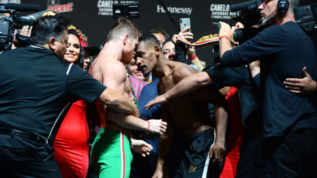 В преддверии объединительного боя в среднем весе чемпион мира по версиям Всемирного боксёрского совета (WBC) и Всемирной боксёрской ассоциации (WBA Super) Сауль Альварес устроил потасовку с обладателем пояса Международной боксёрской федерации (IFB) Дэниелом Джейкобсом.