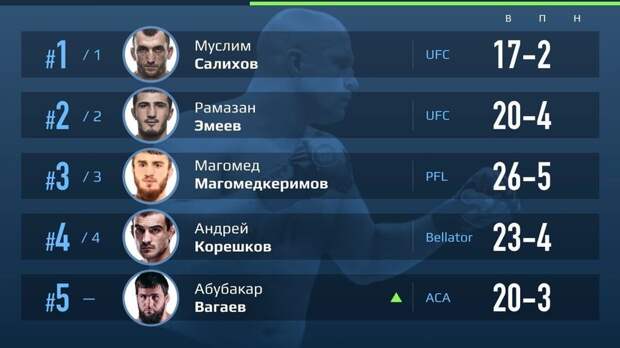 Первое место в апрельской версии рейтинга российских бойцов ММА по версии RT среди представителей полусреднего веса занял Муслим Салихов (UFC). За ним расположились Рамазан Эмеев (UFC), Магомед Магомедкеримов (PFL), Андрей Корешков (Bellator), Абубакар Вагаев (чемпион ACA).