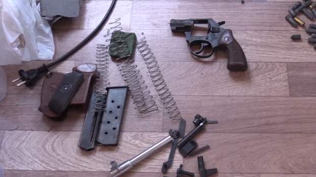Во время обыска обнаружены три пистолета и составные части огнестрельного оружия и боеприпасов.