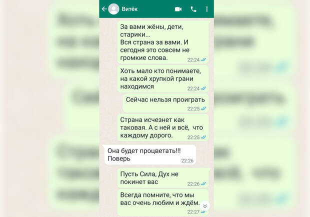 Во время рассказа о детях Ирина показывает их фотографии и переписку с Виктором, когда он уже служил на фронте: «Каждому поколению своя война, как горько всё это. Как тяжко вам, сыночки наши, там. Как тяжко нам жить от связи до связи здесь. Вся надежда только на вас, сейчас нельзя проиграть — страна исчезнет, а с ней и всё, что каждому дорого».