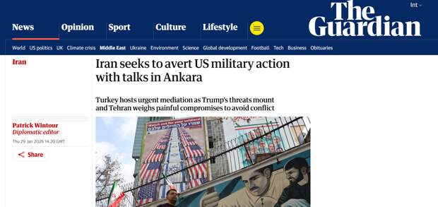 Подготовка Вашингтона к военным действиям против Ирана остаётся одной из главных тем в западных СМИ. Как отмечает Reuters, президент США Дональд Трамп настаивает, чтобы Тегеран пошёл на уступки, прежде чем ВМС США начнут атаковать. The Guardian обращает внимание на посреднические усилия Турции. Государства региона отчаянно отговаривают Белый дом от развязывания войны, передаёт Financial Times.