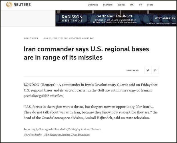 В заголовке западное СМИ пишет:«Иранский военачальник заявил, что региональные базы США располагаются в пределах зоны досягаемости иранских ракет».