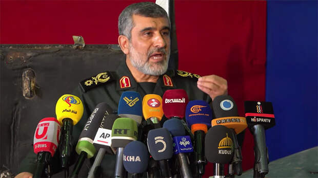 Дело в том, что 21 июня Хаджизаде давал пресс-конференцию, на которой демонстрировал обломки того самого сбитого американского дрона. На мероприятии присутствовали журналисты как иранских СМИ, таких как IRIB, IRINN, Al Alam TV, Press TV и Hispan TV, так и международных изданий — Unews Press Agency (Ливан), Associated Press (США), Al Masirah (Йемен), RT, Al Mayadeen (Ливан), Al-Manar (Ливан), ILKHA (Турция), TV5 (Турция), Kudus TV (Турция) и Ruptly. На записи Ruptly с пресс-конференции можно увидеть микрофоны с логотипами всех этих медиа.