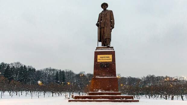 Памятник установили в 1954 году. Его автор — скульптор Дмитрий Жилов. На тот момент в саду было высажено более 500 сортов плодовых и ягодных деревьев и кустарников, среди которых были и те, что вывел Мичурин.