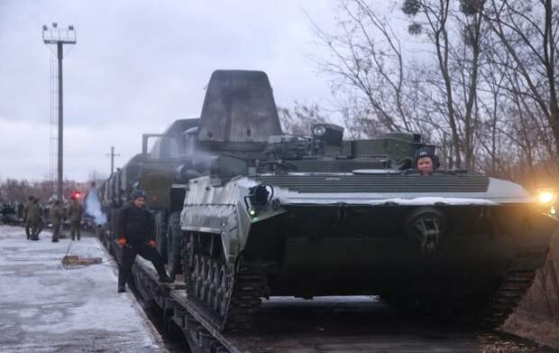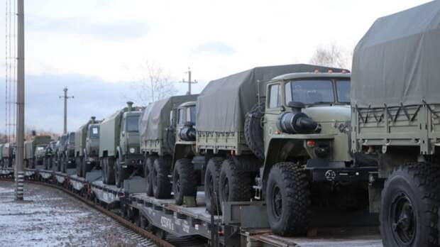 В Минске не уточнили состав группировки ВС РФ, которая будет выполнять задачи в Белоруссии, но на распространённых кадрах разгрузки эшелонов запечатлены российские армейские грузовики и БМП.