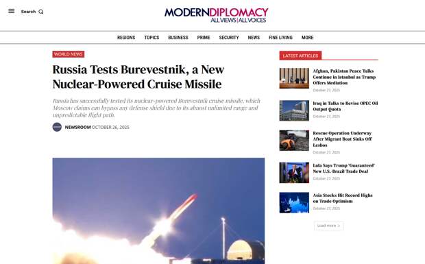 В свою очередь, портал Modern Diplomacy пишет, что новая российская ракета «позиционируется как ответ на инициативы США по ПРО и на расширение НАТО». «Буревестник», по мнению автора статьи, «акцентирует внимание на военном потенциале России и на готовности нанести ответный удар в случае нападения (на Россию. — RT)».