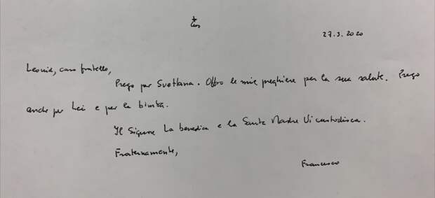 «Леонид, дорогой брат. Молюсь за Светлану. Прежде всего за её здоровье. Молюсь также за вас и за малышку (дочь Наташу. — RT). Пусть Господь вас благословит, а Святая Мать утешит. С братским приветствием, Франциск», — говорится в послании понтифика.