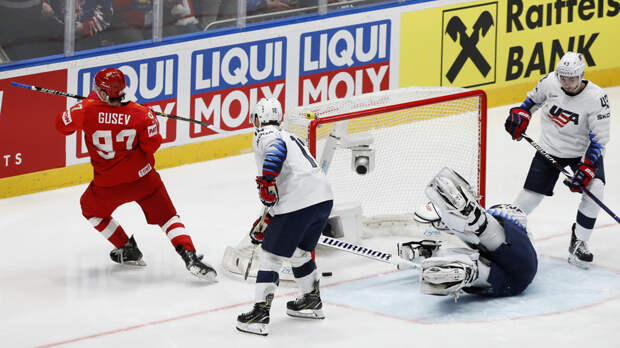 Сборная России обыгрывает национальную команду США по итогам первого периода матча 1/4 финала чемпионата мира по хоккею 2019 года в Словакии.