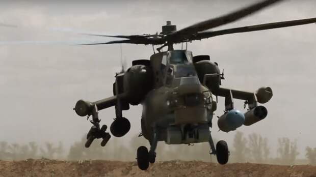 Российский вертолёт Ми-28НМ ударил авиаракетами по скоплению сил ВСУ в приграничном районе Курской области.