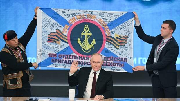 Во-вторых, будем считать, что это знамя 155-й бригады морской пехоты Тихоокеанского флота здесь представляет все боевые знамена наших бойцов, которые сражаются сейчас за Россию, за Родину, на всей линии боевого соприкосновения», — отметил он.Путин в ходе пресс-конференции по итогам года также заявил, что нельзя загадывать, сколько ещё продлится специальная военная операция.