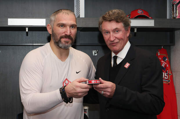 Овечкин и Гретцки с той самой рекордной шайбойGettyimages.ru Bruce Bennett