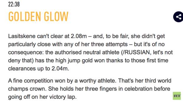 «Ласицкене не смогла преодолеть планку на высоте 2,08 м, и если говорить начистоту, то она ни в одной из трёх своих попыток не была к этому близка, но это не так важно: спортсменка с нейтральным статусом (россиянка, давайте не будем этого отрицать) взяла 2,04 м с первой попытки и завоевала золото. Это её третий триумф подряд. Прекрасное соревнование, выигранное достойным спортсменом. Мария поднимает три пальца, празднуя успех, прежде чем совершить круг почёта», — говорится в сообщении.