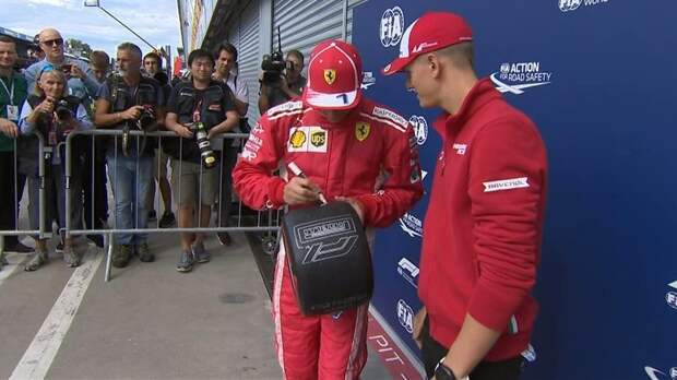 Мик Шумахер, сын семикратного чемпиона мира Михаэля Шумахера, вручил финскому пилоту «Феррари» Кими Райкконену приз за победу в квалификации 14-го этапа «Формулы-1» Гран-при Италии.