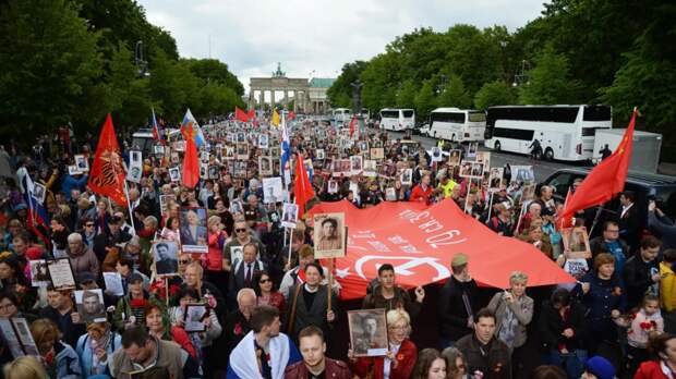 В руках участники шествия несут портреты своих предков, сражавшихся против фашистской Германии в годы Второй мировой войны.