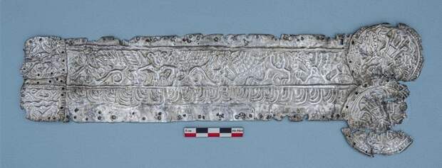 С правой же стороны изделие дополнено двумя круглыми бляхами, на каждой из которых фигурирует антропоморфный персонаж в окружении двух грифонов. Как отмечают в Институте археологии РАН, учёным пока неизвестно, о каких именно персонажах в данном случае идёт речь, как и о назначении серебряной накладки.
