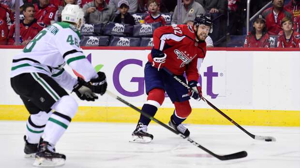 Российский нападающий клуба «Вашингтон Кэпиталз» Евгений Кузнецов в ходе подготовки к матчу регулярного чемпионата Национальной хоккейной лиги (НХЛ) с «Даллас Старз» тренировался в третьем звене.