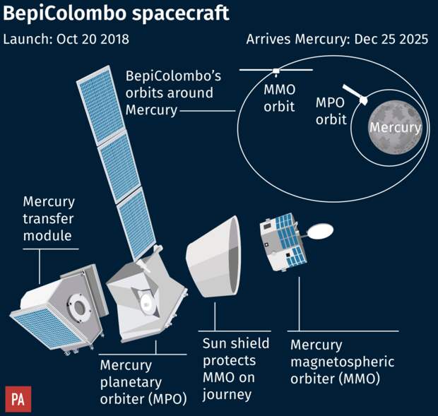 Им предстоит исследовать состав поверхности планеты и распространённость водяного льда в её полярных областях, а также выяснить происхождение магнитного поля ближайшего соседа Солнца.Рано утром 20 октября с космодрома Куру в Гвиане (департамент Франции в Южной Америке) состоялся запуск космического корабля в рамках миссии по изучению Меркурия BepiColombo. Исследовательская станция состоит из перелётного модуля Mercury Transfer Module (MTM), пристыкованного к двум научным аппаратам: европейскому Mercury Planetary Orbiter (MPO) и японскому Mercury Magnetospheric Orbiter (MMO). Планируется, что ближайшей к Солнцу планеты он достигнет через семь лет.