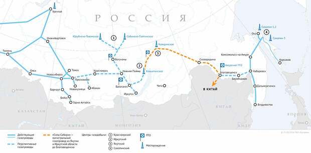 Напомним, газопровод «Сила Сибири» проходит из России в Китай. Это совместный проект «Газпрома» и Китайской национальной нефтегазовой корпорации (CNPC). Он начинается с Ковыктинского газового месторождения, проходит через Чаяндинское, затем приходит к Амурскому газоперерабатывающему заводу и оттуда уже тянется на китайскую сторону.