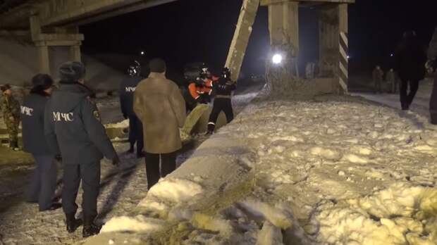 На записи видно, что опора моста сильно деформирована, местами из конструкции торчит арматура.