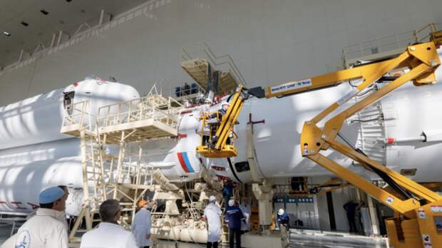 Отмечается, что специалисты состыковали космическую головную часть в составе разгонного блока «Орион» и испытательной полезной нагрузки с «пакетом» из трёх ступеней ракеты-носителя «Ангара-А5».