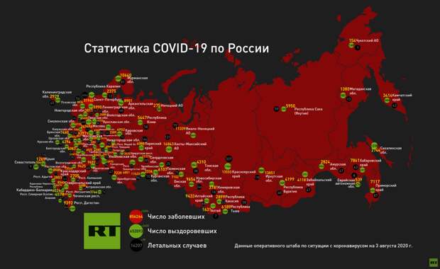 С начала эпидемии в России были выявлены 856 264 инфицированных коронавирусом. В общей сложности зафиксировано 14 207 летальных исходов (1,66%) от осложнений, развившихся на фоне COVID-19 и сопутствующих заболеваний. За прошедшие сутки скончались 79 человек.
