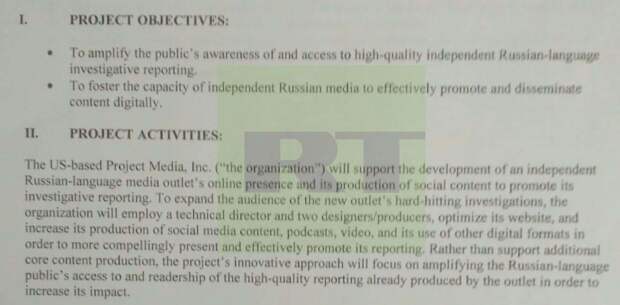 В распоряжение RT попали документы, связанные с изданием «Проект», известным своим расследованием под названием «Телега из Кремля» и рядом других «обличающих» российские власти материалов. Как оказалось, называющее себя независимым медиа финансировалось из-за рубежа — в форме так называемых грантов от европейских и американских властей.
