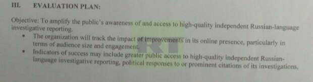 «Организация должна отслеживать влияние и динамику своего присутствия в интернете, особенно с точки зрения охвата аудитории и степени её вовлеченности, — говорится в приложении к соглашению с NED. — К показателям успеха могут относиться расширение доступа общественности к высококачественным независимым журналистским расследованиям на русском языке, отклик со стороны политиков на расследования или привлёкшие широкое внимание ссылки на них, более активное обсуждение и информированность об альтернативных точках зрения, отличающихся от продвигаемого властями дезинформационного и пропагандистского дискурса».